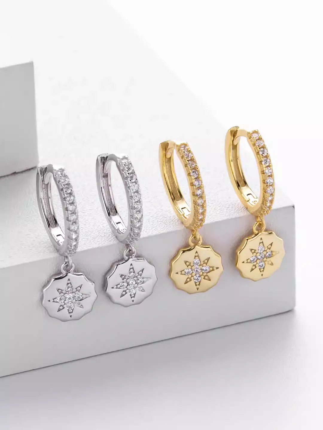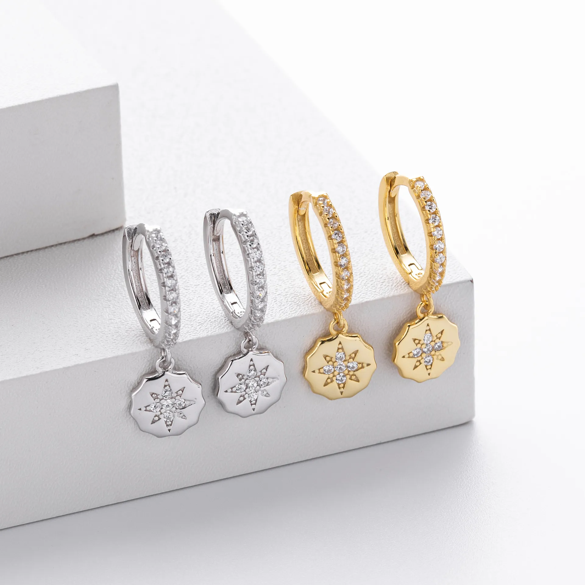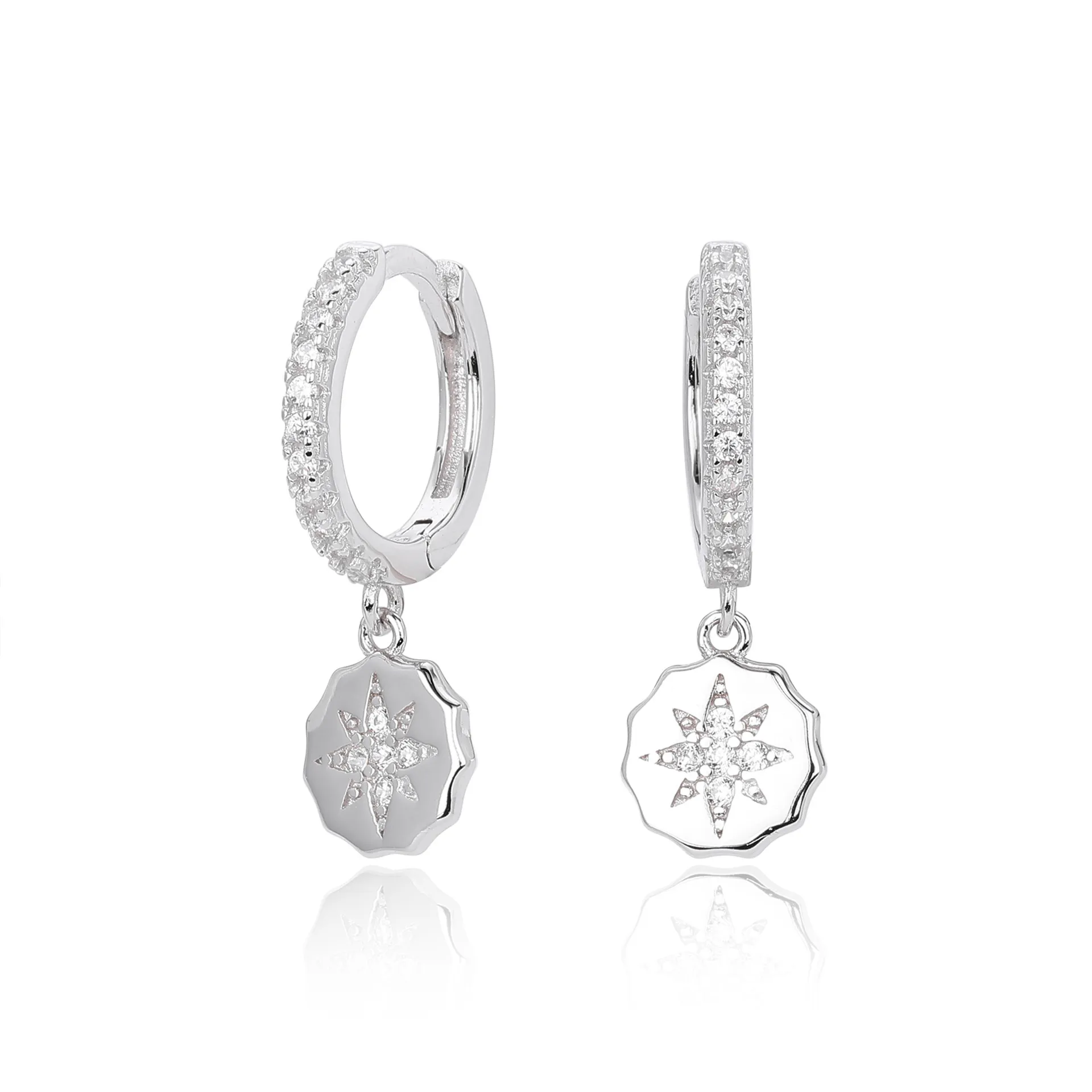 Crafted in 925 sterling silver, the Celestial Medallion earrings shimmer with precisely set 5A grade zircon stones. The brilliant star-shaped medallion pendant radiates brilliance, delicately suspended from a polished hoop also adorned with stones. Their refined sparkle adds sophistication without overpowering your style.
