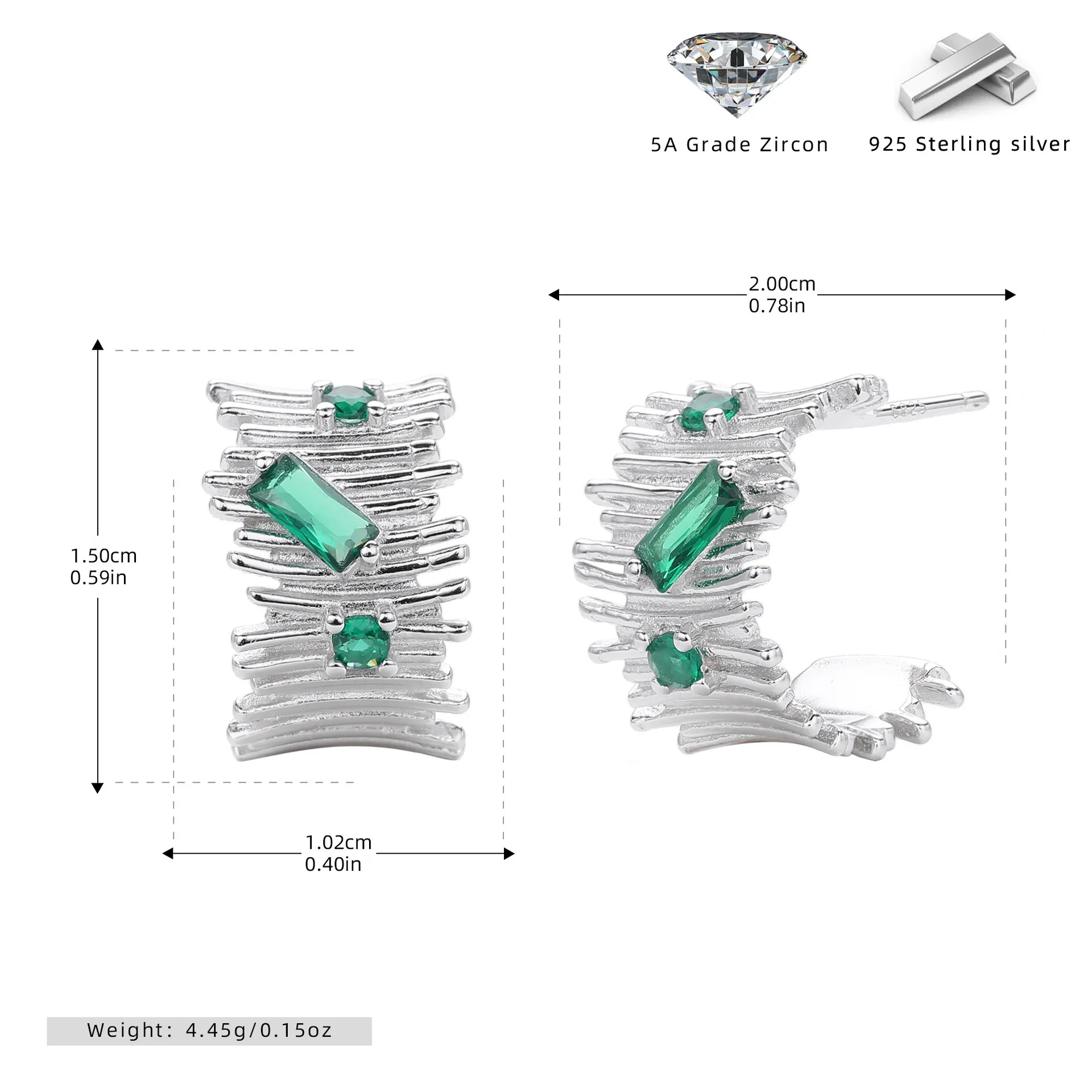 Emerald Horizon showcases a dynamic structural composition. The earrings feature tiered sterling silver segments resembling modern architectural motifs, each carefully curved to embrace the ear. The profile is enhanced by an open hoop form, offering depth and movement without bulk.