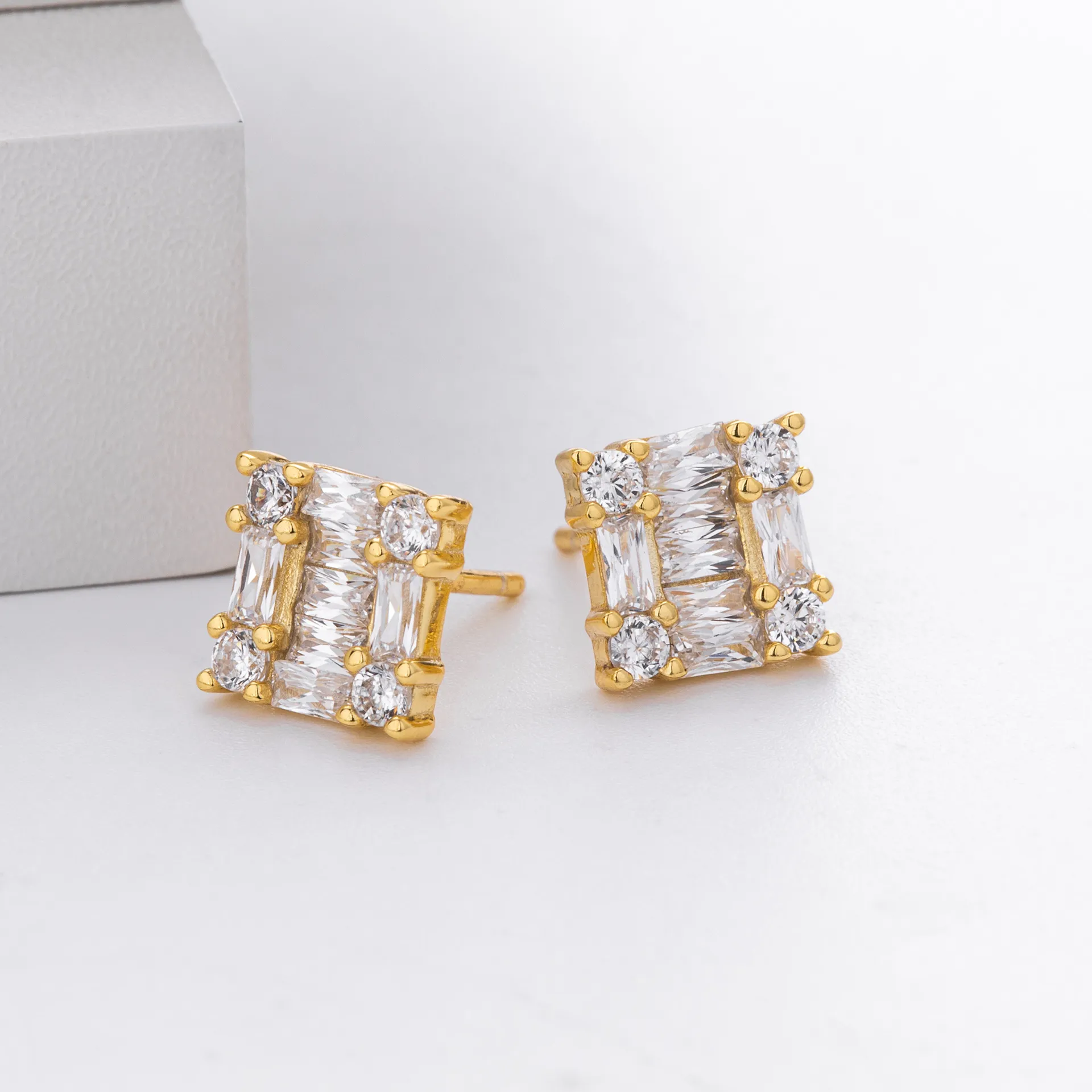 The Gilded Block earrings offer a structured form that stands out. Inspired by modern architecture, this pair presents a geometric layout composed of 5A grade zircons. The layout resembles a stylized block design, which creates a luxurious yet contemporary feel. These earrings are designed to frame the ear with symmetry and brilliance.