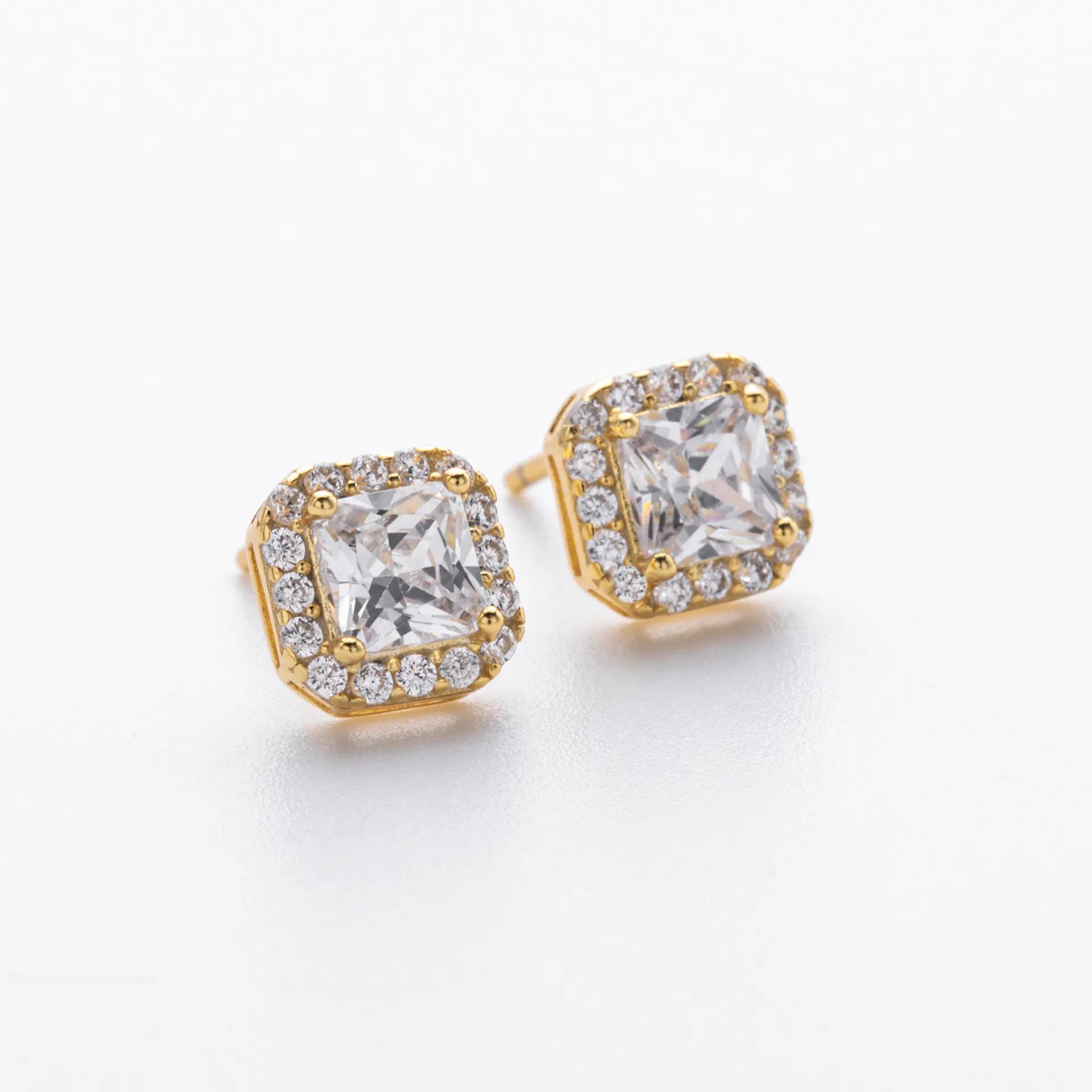These earrings feature a large central 5A zircon stone in a princess cut, framed perfectly by smaller round zircons. The stones are meticulously prong-set to maximize brilliance and durability. The clear stones catch and reflect light, giving the piece its signature “iced” appearance.