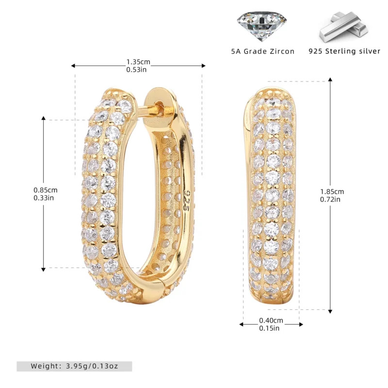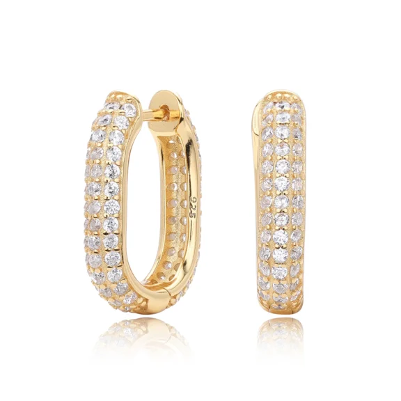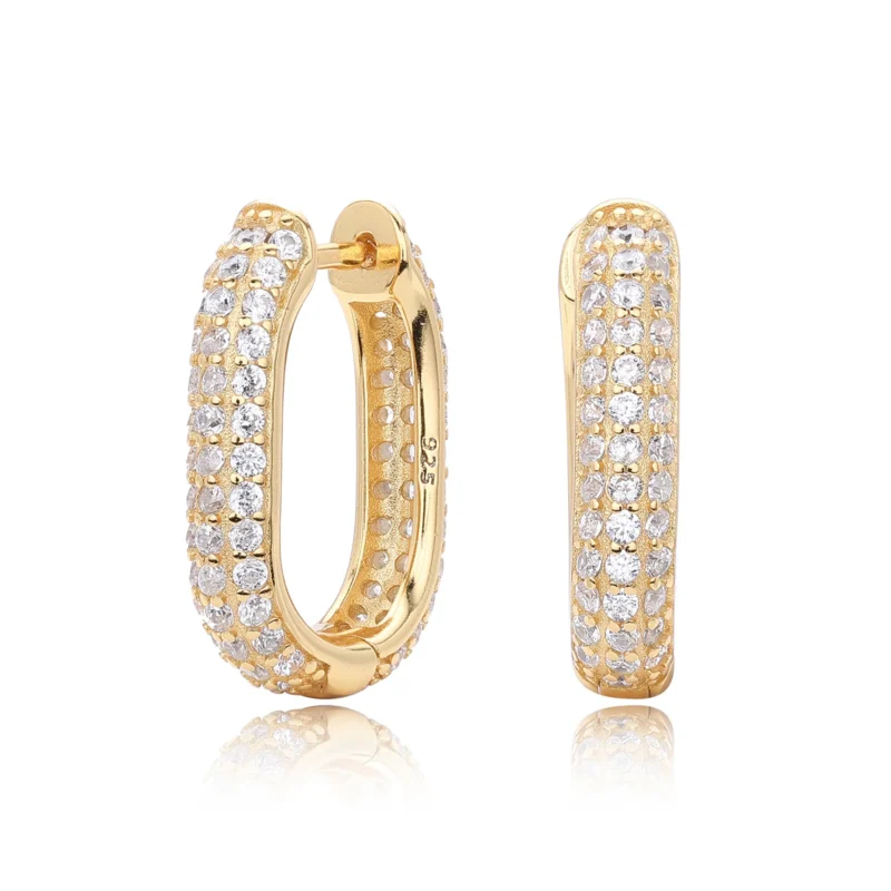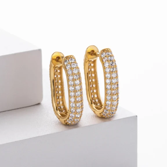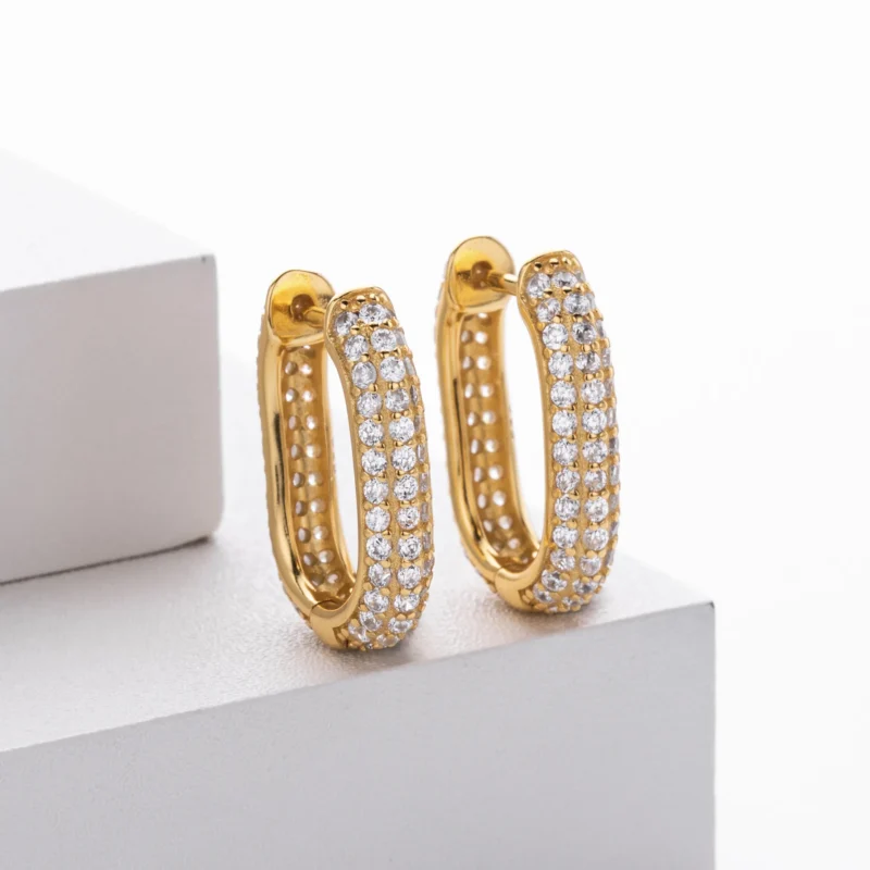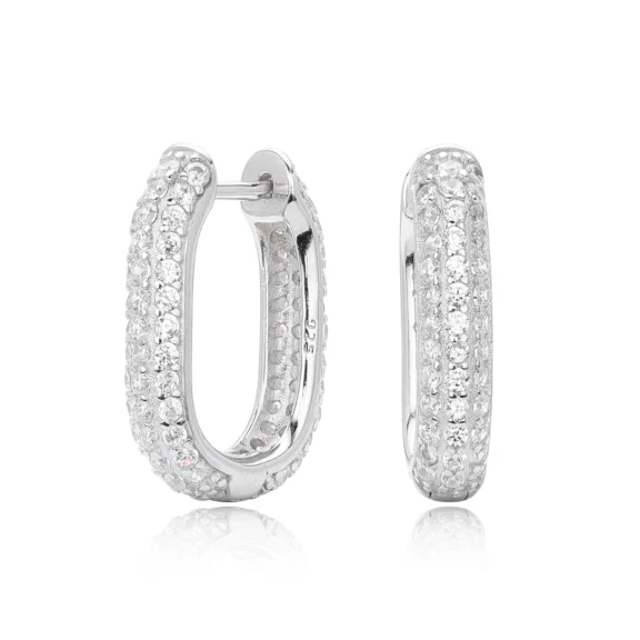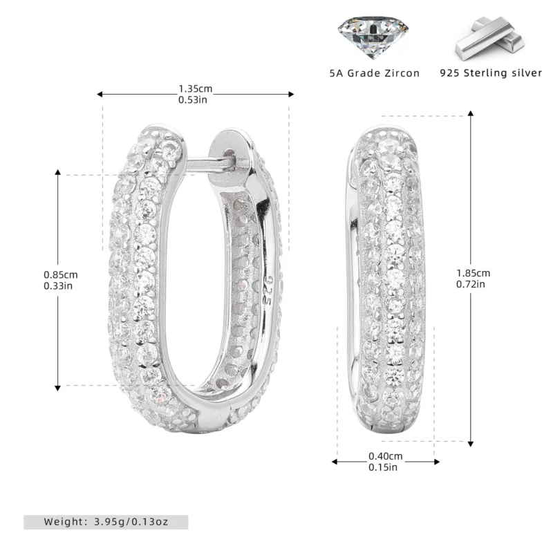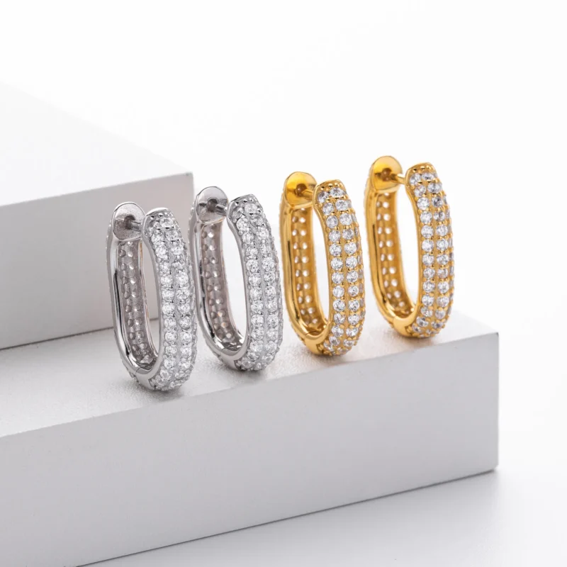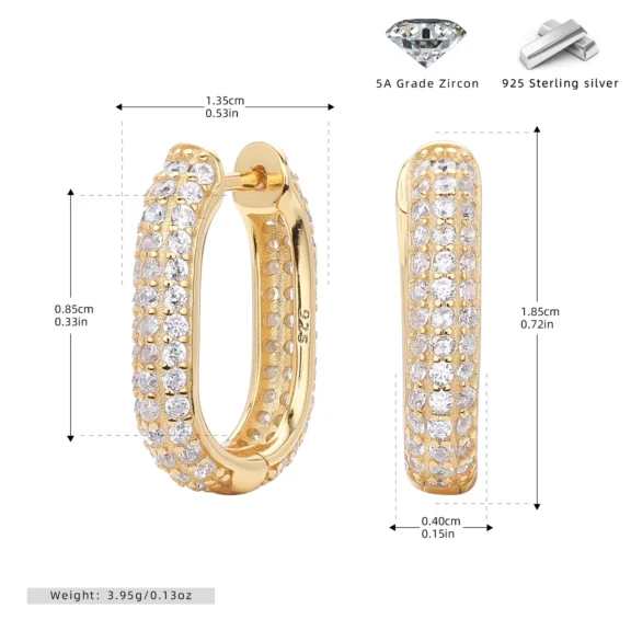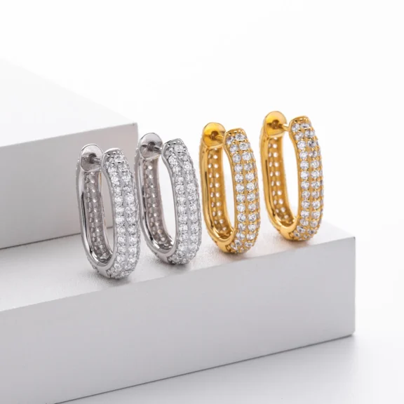 Crafted from 925 sterling silver, Lustrous Luxe offers a strong yet lightweight base, weighing 3.95g per pair. Ideal for wholesale buyers seeking a luxurious aesthetic, the hoops are paved with rows of 5A grade zircon stones, delivering an exceptional sparkle under any light.