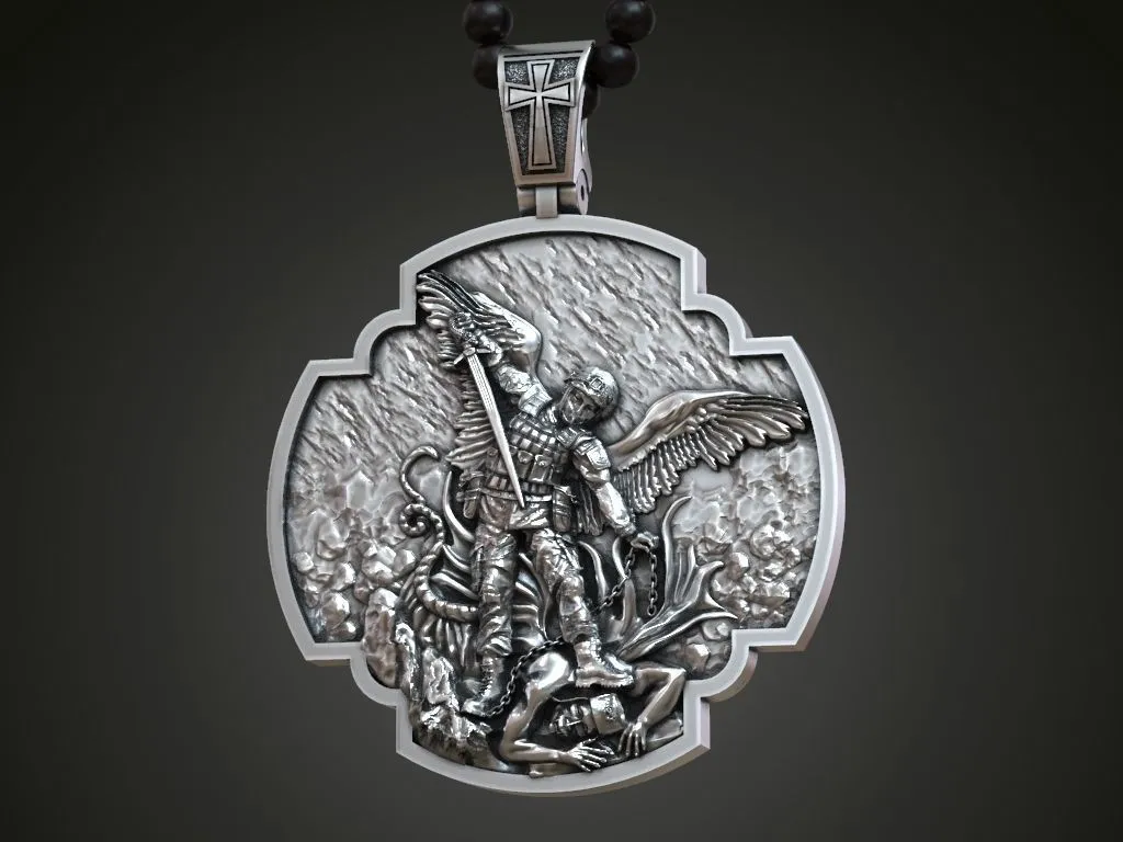 - Design: Intricately detailed depiction of Archangel Michael standing victoriously over a defeated foe, symbolizing protection and strength
