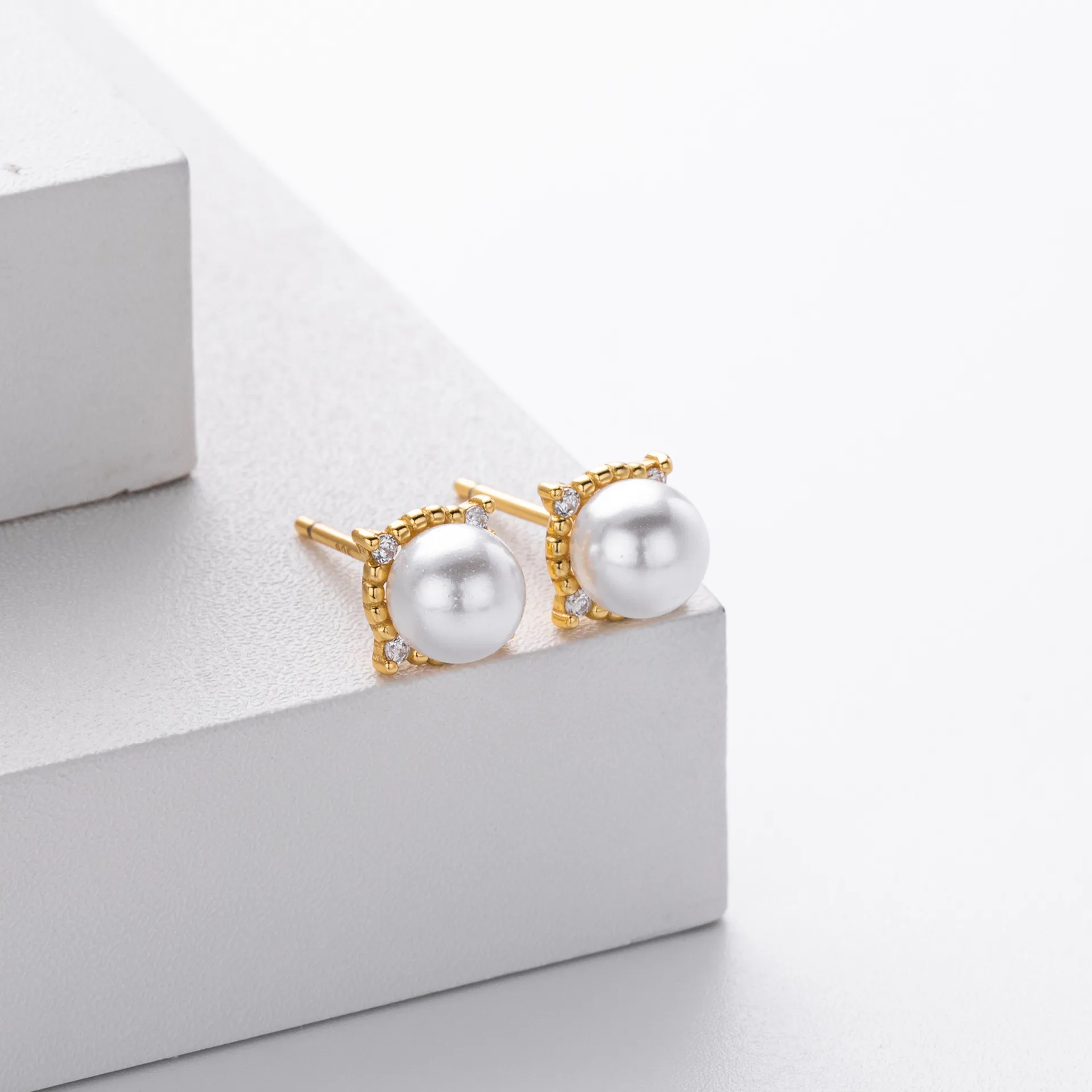 Each earring features a high-gloss pearl at the center, measuring approximately 0.67 cm in height, surrounded by four sparkling zircons that are masterfully placed to resemble a petite crown. The total diameter of 1.75 cm gives the piece presence without overpowering. The Regal Pearl Crown is balanced and symmetrical, creating a graceful silhouette that works across generations and style preferences.