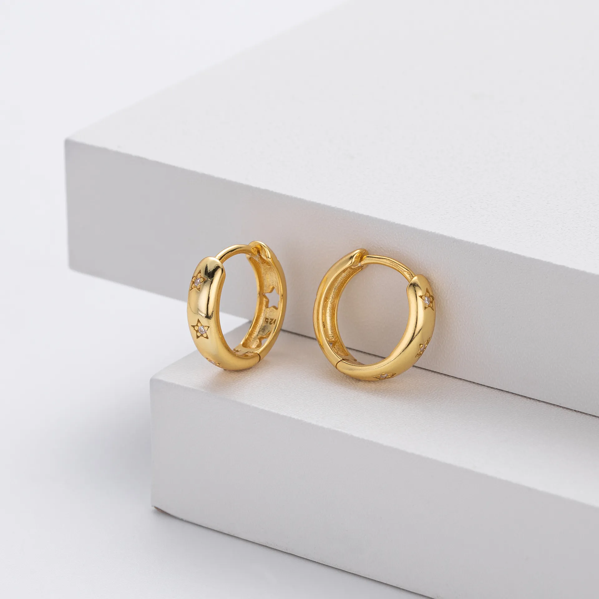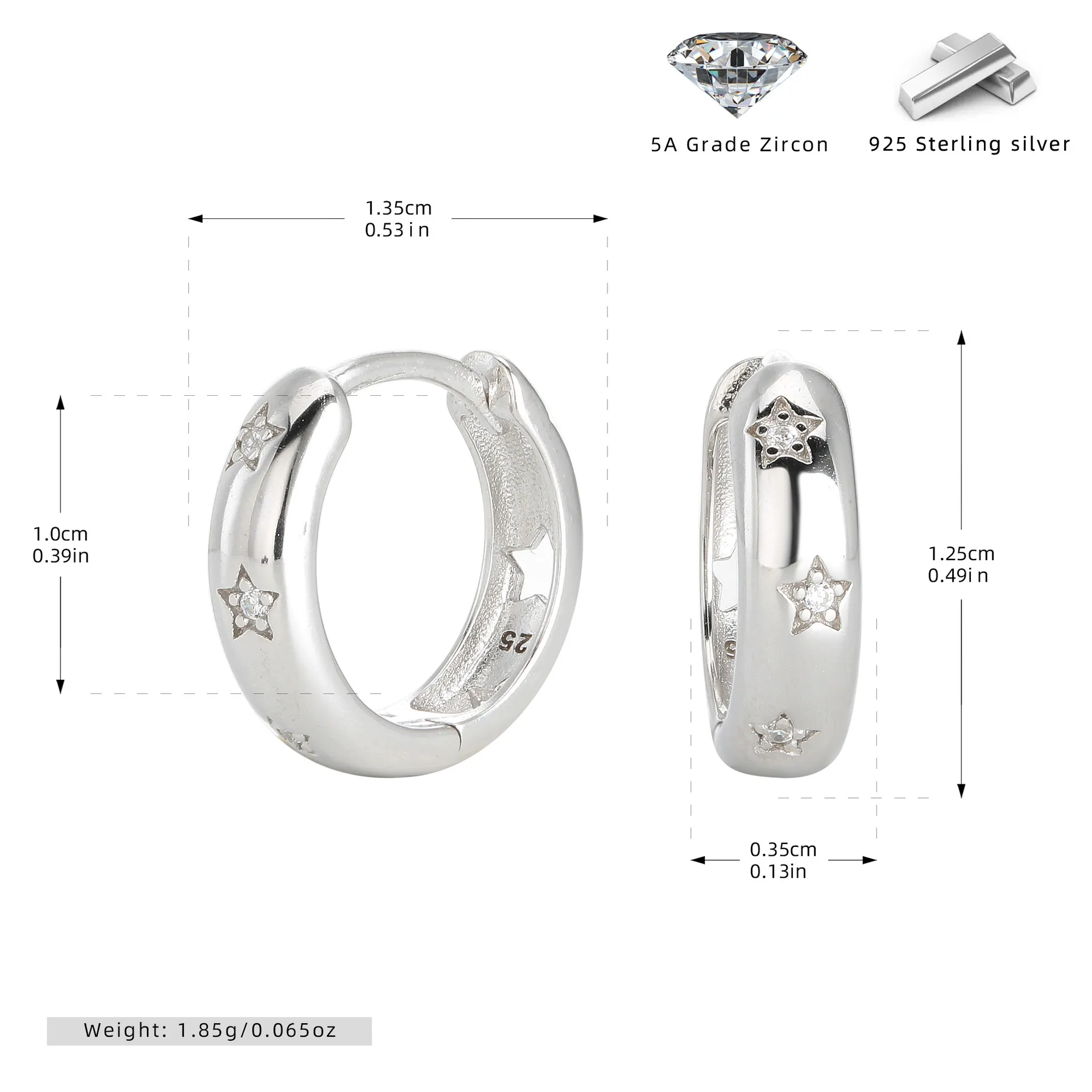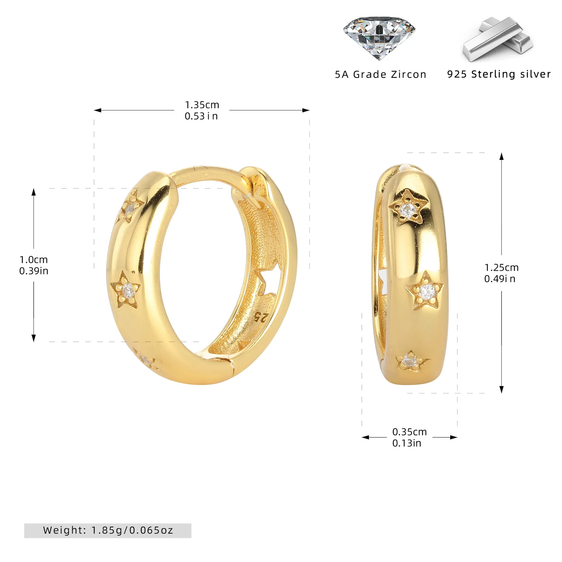 Each star is inlaid with high-quality zircon stones, known for their radiant brilliance. The zircon accents capture and reflect light beautifully, adding a luxurious sparkle to the earrings. The combination of polished hoops and dazzling stars makes these earrings an exceptional choice for customers who appreciate understated glamour with a celestial twist.