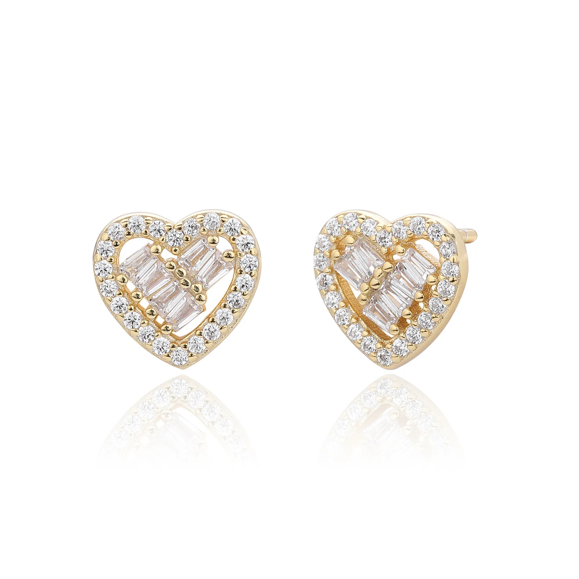 The craftsmanship highlights meticulous stone placement and a smooth, curved outline. The heart silhouette is classic, while the internal arrangement of baguette-cut zircons gives a modern twist. With their mirror-polished surfaces and secure stud backing, these earrings reflect excellent workmanship in every detail.